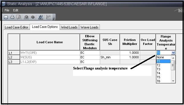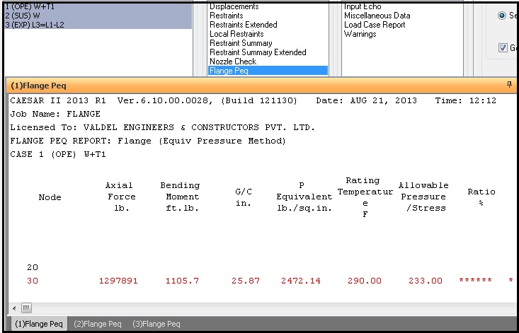 Now go to the load case editor of Caesar II and select the temperature at which flange leakage checking is to be performed as shown in Fig. 3. Normally, flange leakage is performed at the maximum design temperature. So, select that temperature. Now run the analysis to check the results. In case the calculated flange stress exceeds the allowable results will be shown in red color. The report will show the % ratio of the calculated equivalent pressure with respect to allowable. Check Fig. 4 for output results.