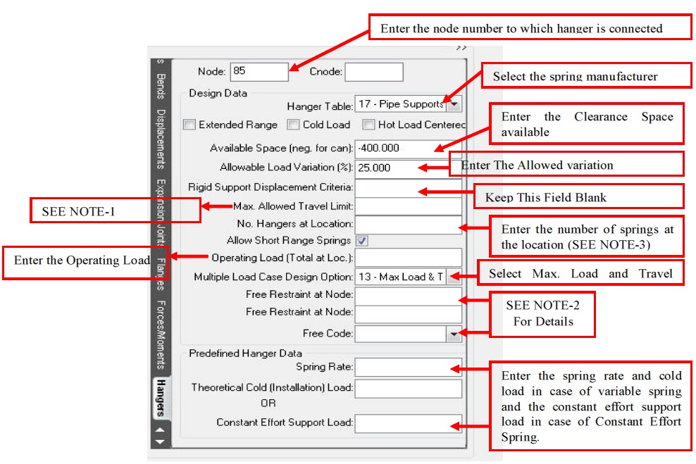 NOTE-2: Free Code: Anchor or Restraints from equipment connections which are very near to the hangers are usually freed during the hanger design restrained weight run so that loads normally going to the equipment nozzle is carried by the hanger. The hanger can be designed to take almost the full weight of the pipe between the anchor and the hanger Using this field enter the node number & the direction in which free code is to be used.
